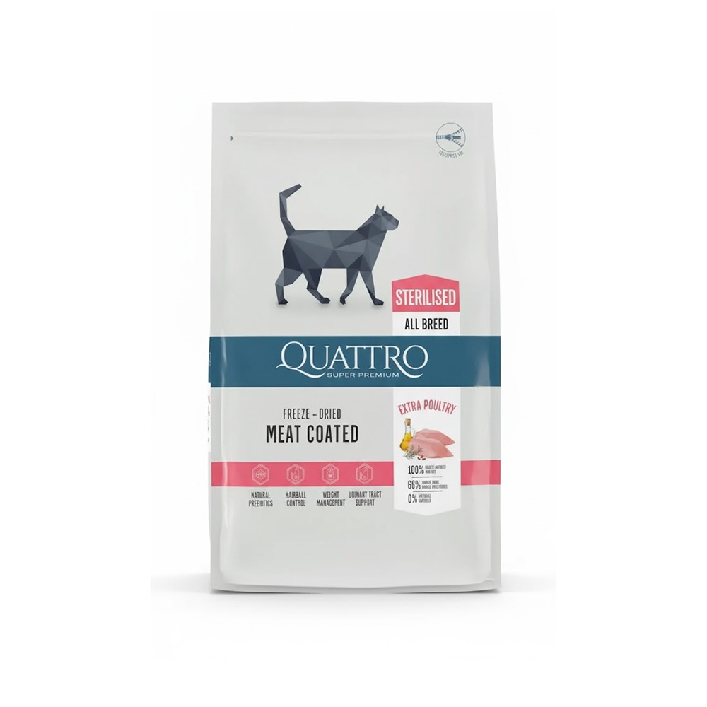 طعام QUATTRO Super Premium مصمم للقطط المعقمة، بتركيبة متوازنة عالية الجودة لدعم الصحة والتحكم بالوزن.